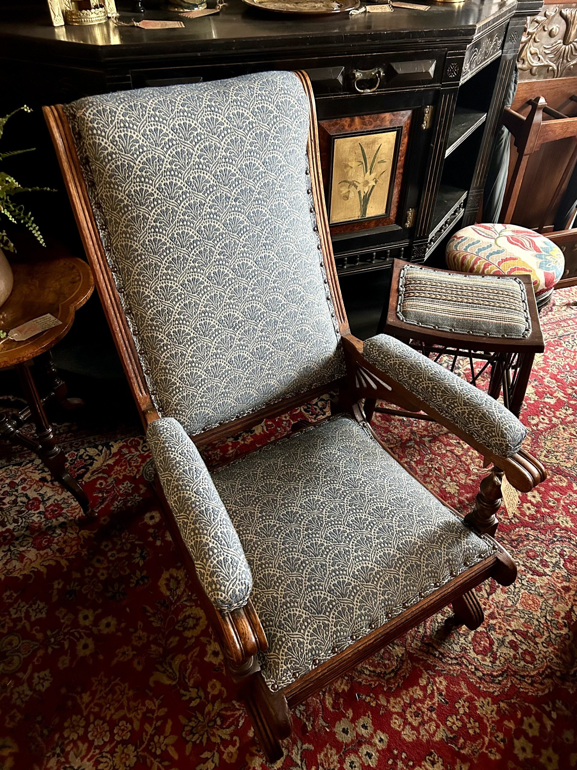 A handsome and very comfortable American Aesthetic Movement platform rocking chair with lovely detailing to the solid oak frame. Recently reupholstered in Zoffany Tudor Damask archive fabric in Indigo with bronze stud detailing.