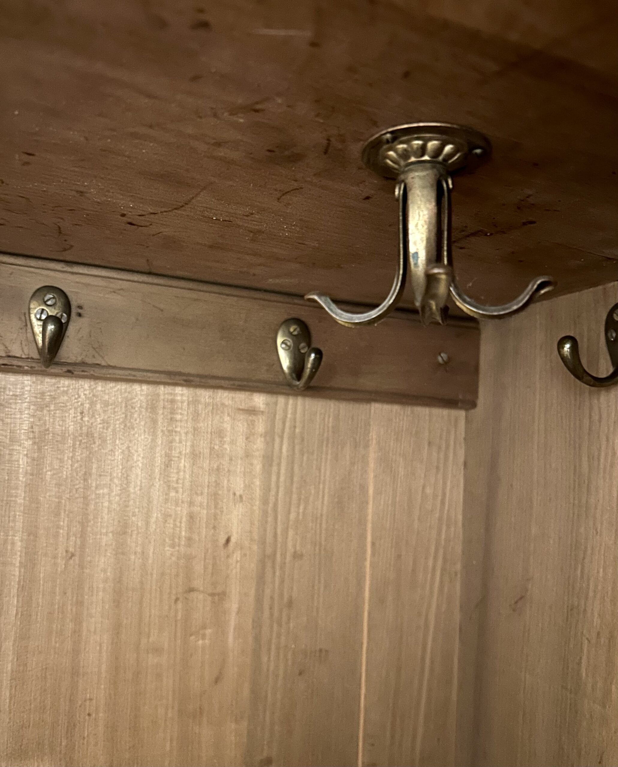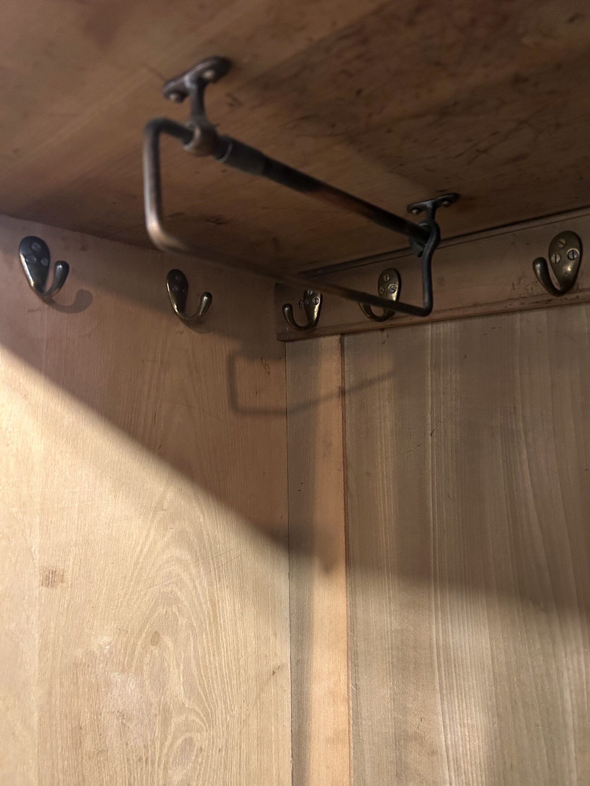 Twin full height compartments with original hooks and trouser hangers. The base with two capacious drawers in one third/ two thirds configuration, raised on shaped bracket feet. All original patinated copper hinges, handles and locks marked “S P B”.