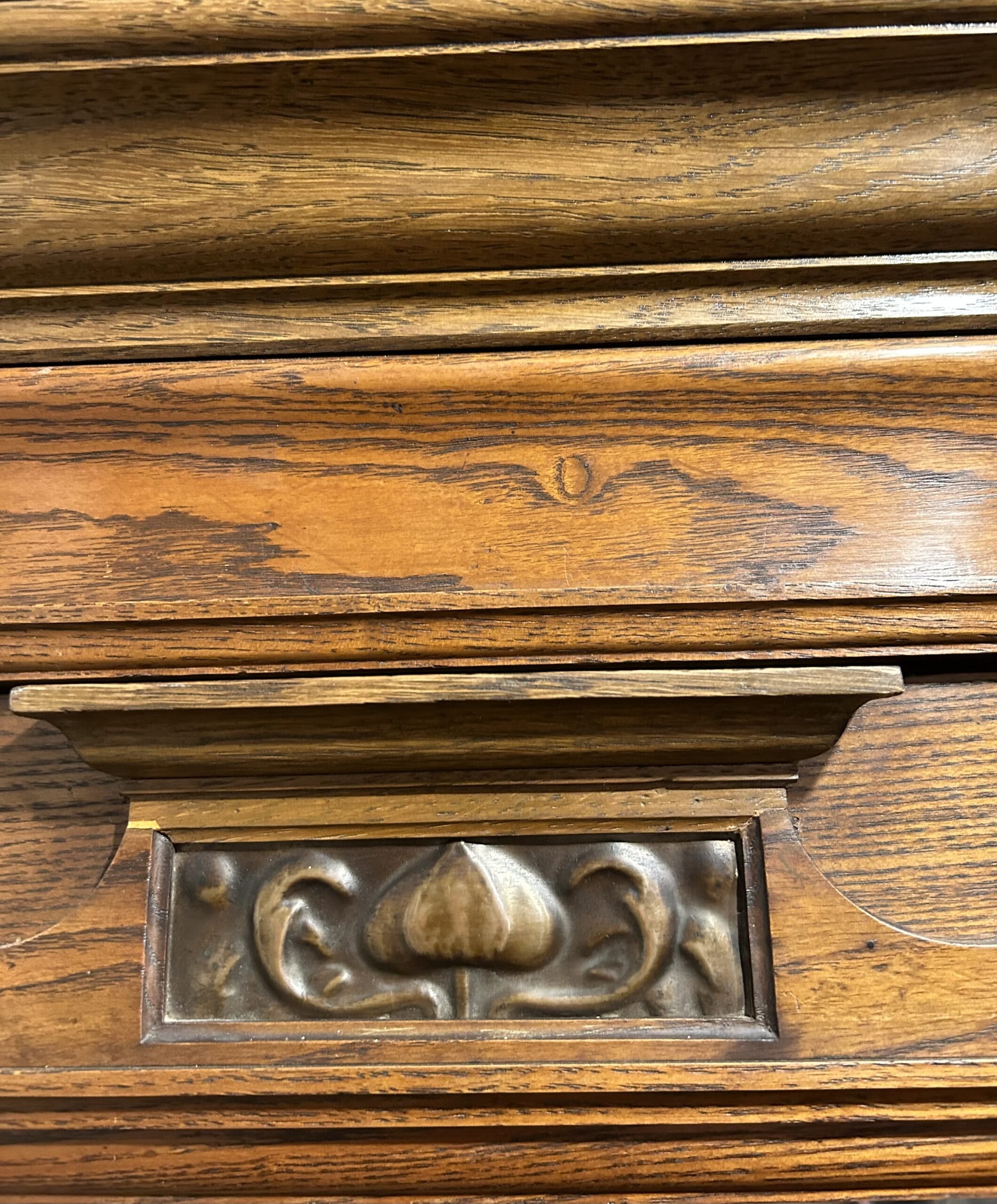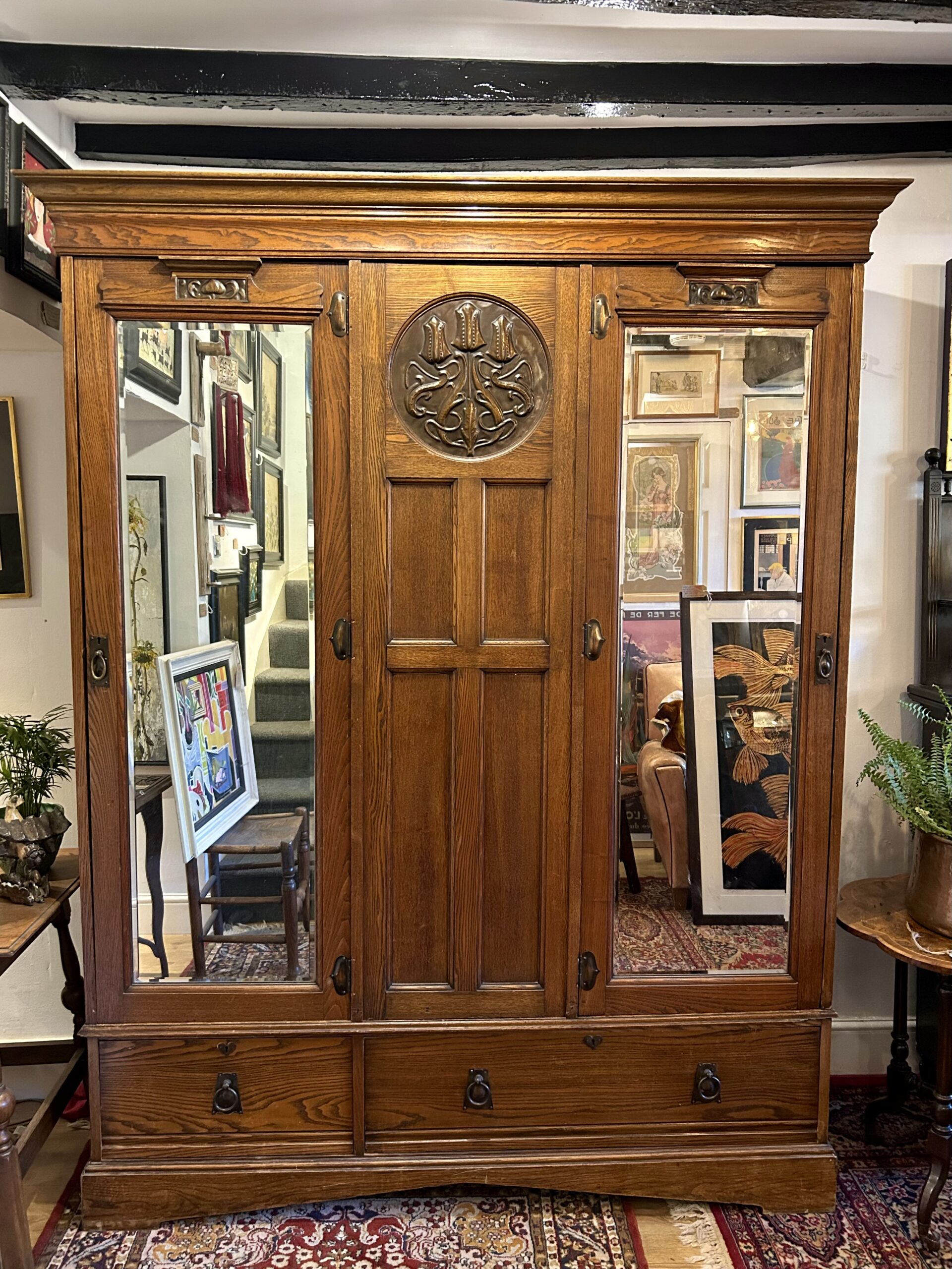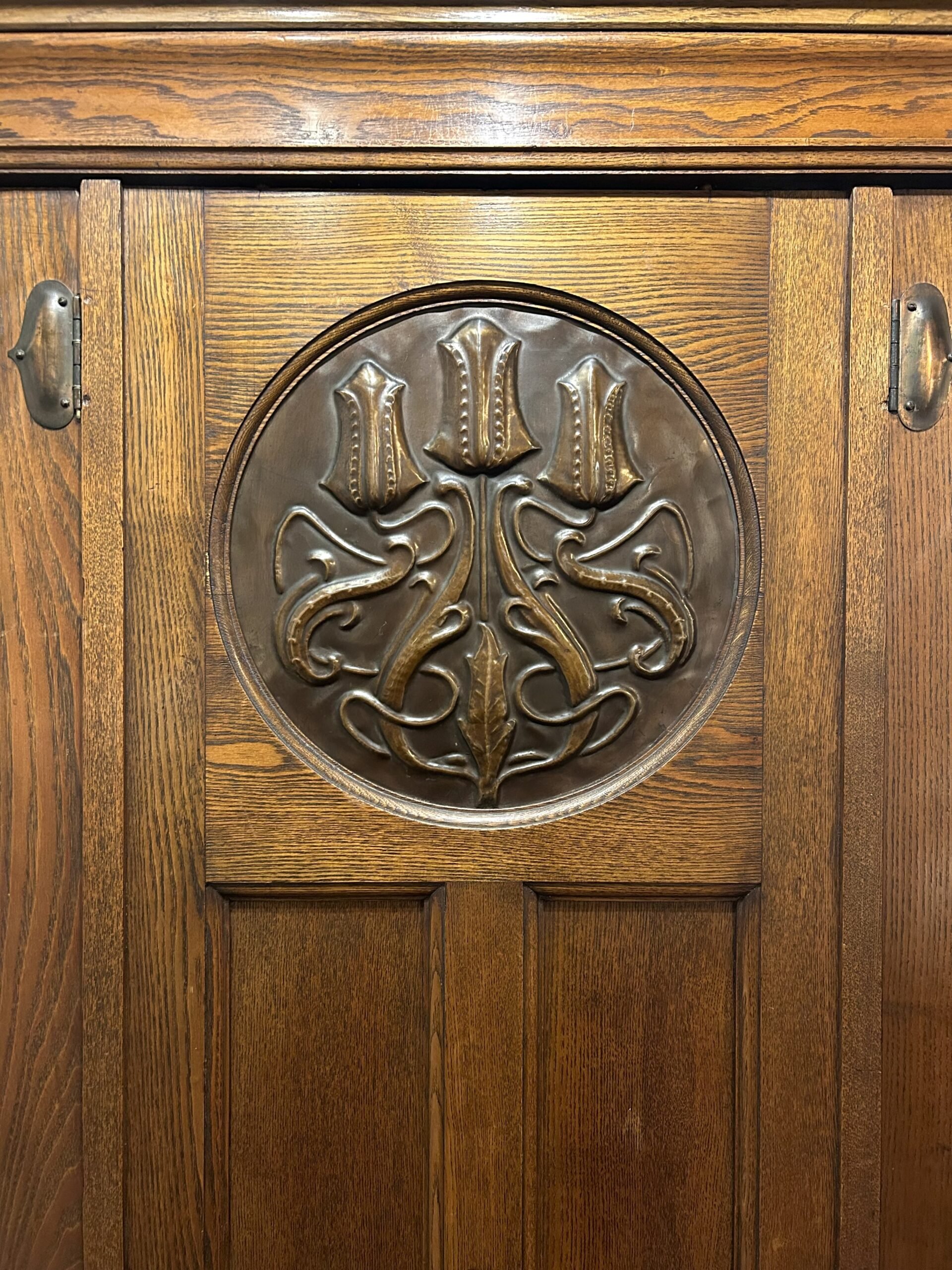 Under a flared cornice and frieze, a pair of bevelled mirror doors topped with carved pediment mouldings inlaid with copper panels in a characteristic Arts and Crafts bud design; flanking a central fielded panel topped with a striking inlaid circular repoussé copper panel in a stylised tulips design.