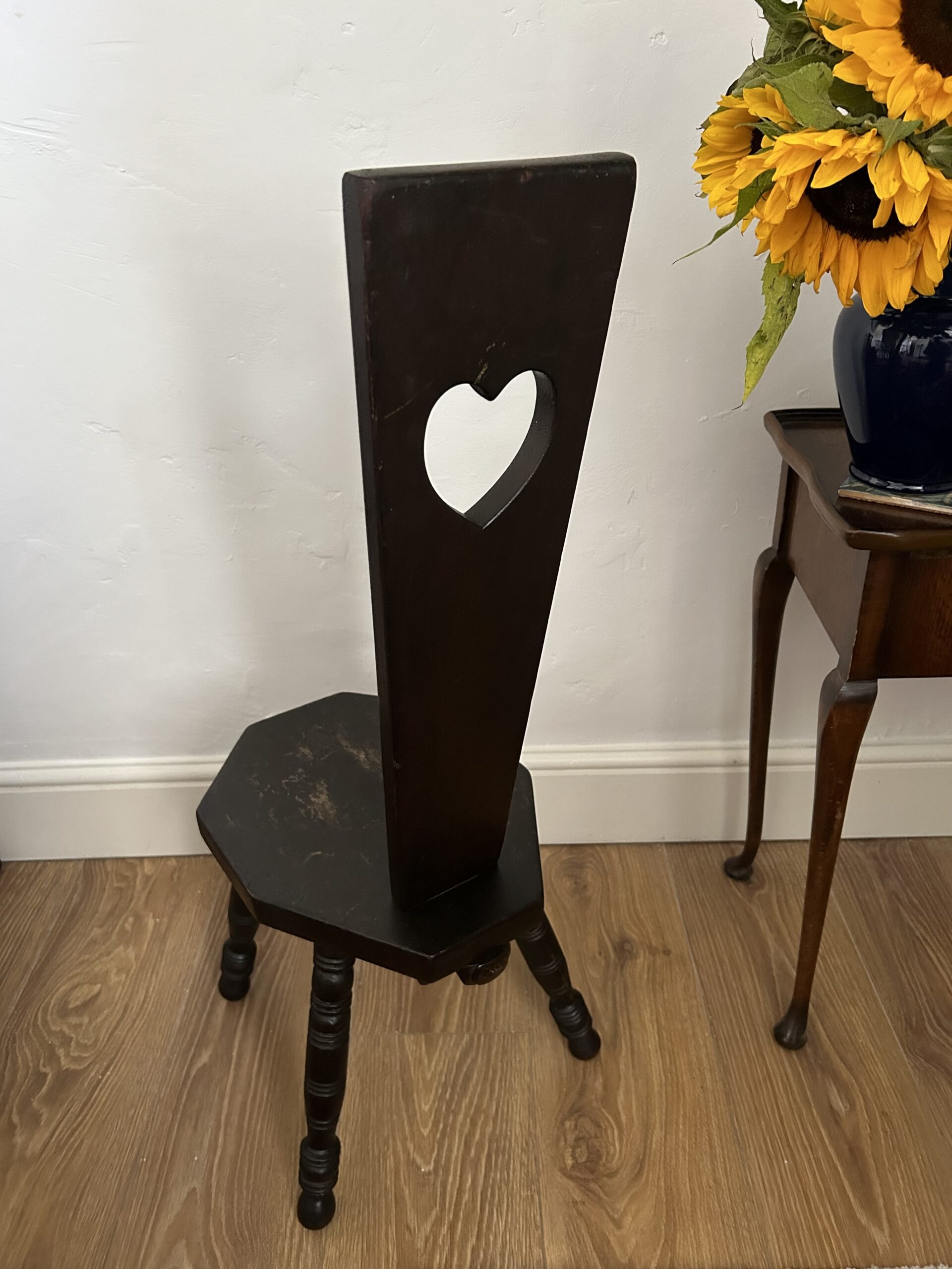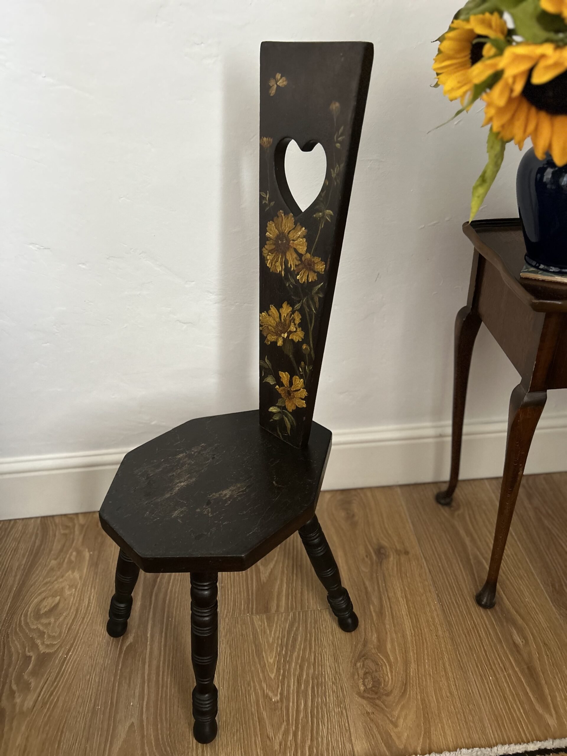 An early 20th Century oak spinning chair or “Welsh love seat”, raised on turned legs with charming hand painted floral design and characteristic cut out heart motif to the back. Solid condition with wear to the seat commensurate with age and use.