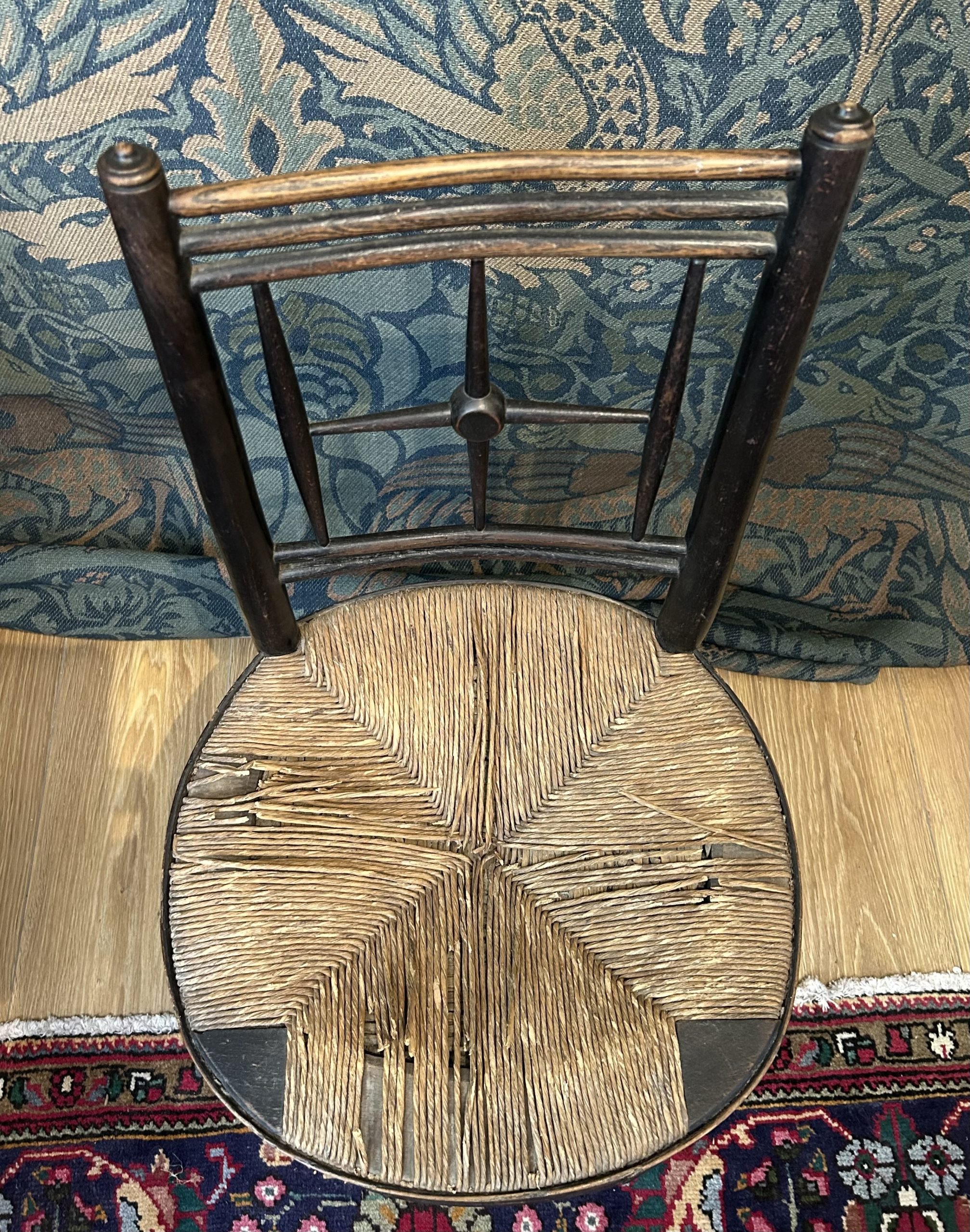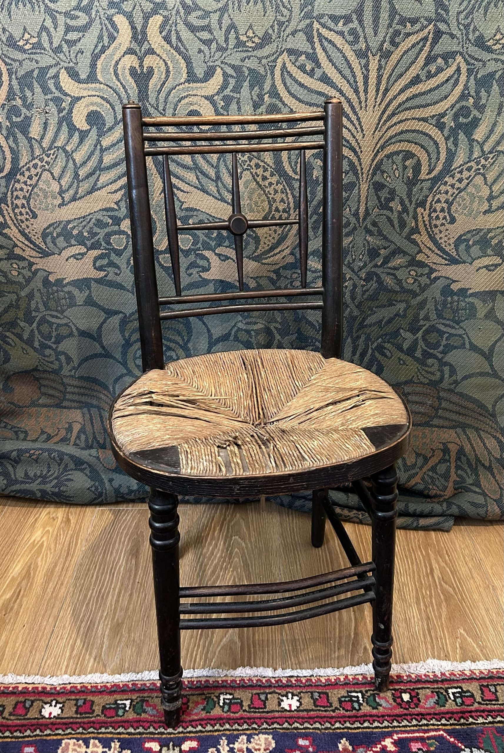 A nice example of the rarer round rush seat chair from the Morris & Co “Sussex” range, which was first inspired by “an old chair of village manufacture picked up in Sussex”, according to Professor J W Mackail in his “Life of William Morris” (1901). Having a spindle frame with cross-shaped splat and ring turned legs.