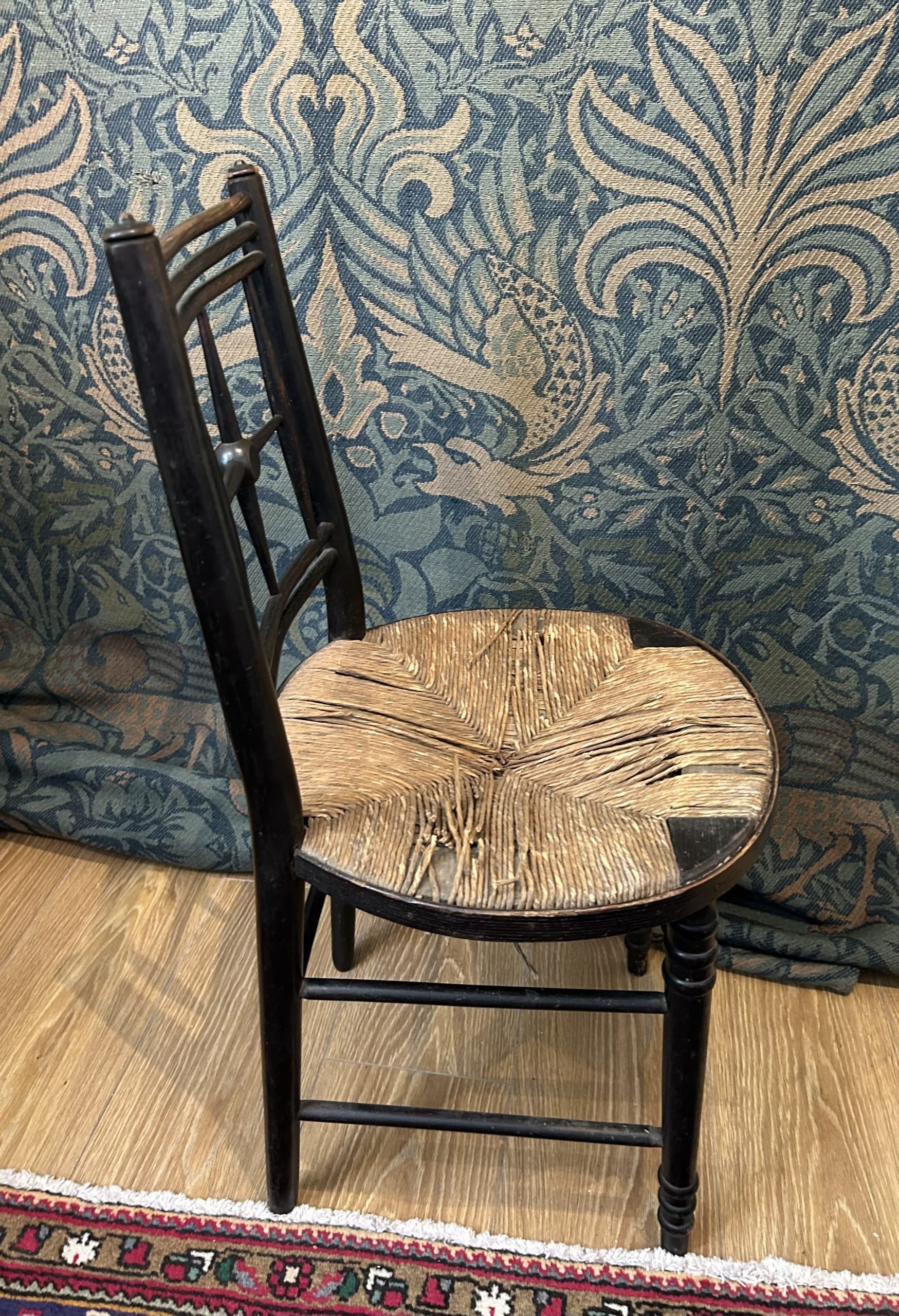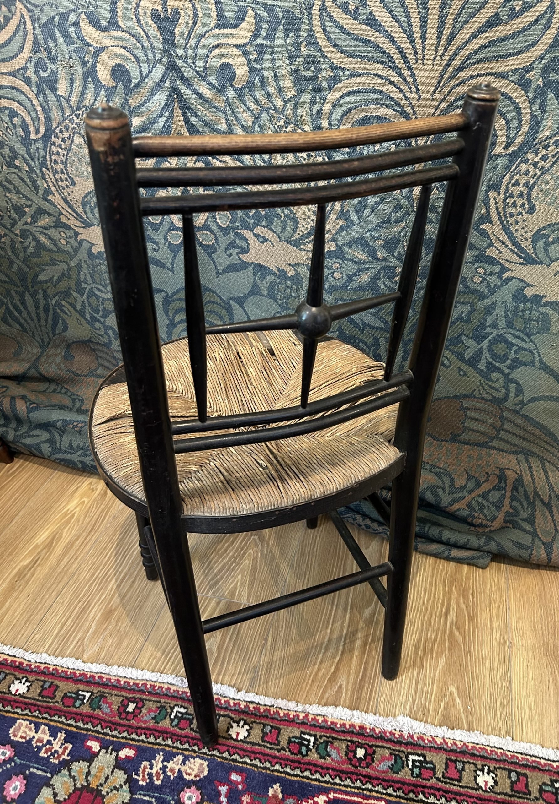 This chair design, made of beech, stained black (ebonised), still featured in the Morris & Co catalogue of 1910/11, (page 63), where it was priced at 10 shillings and sixpence.