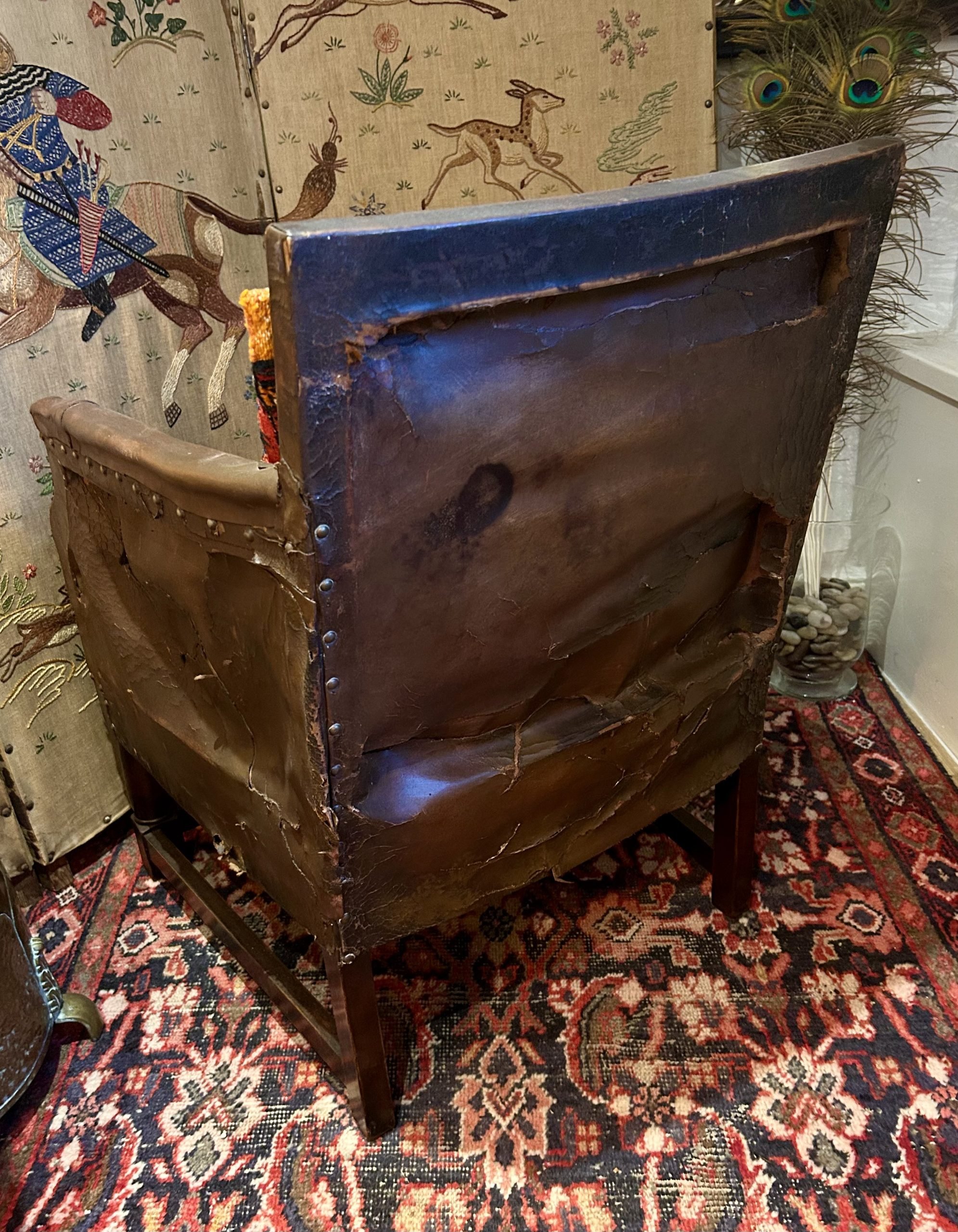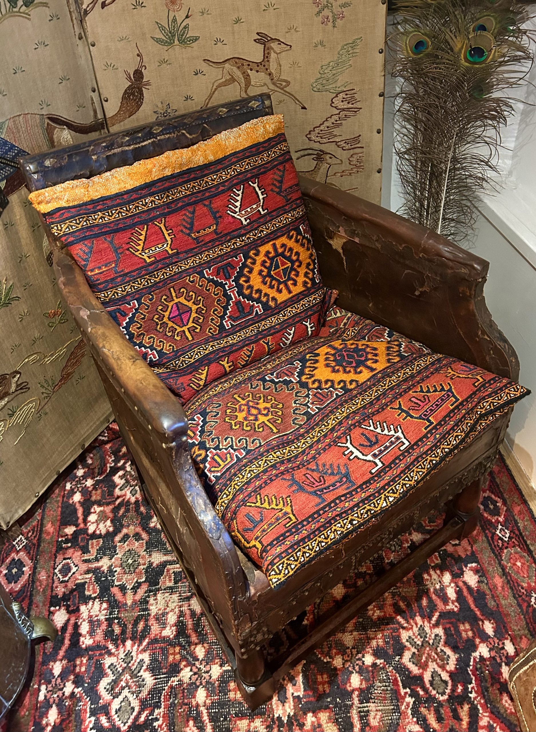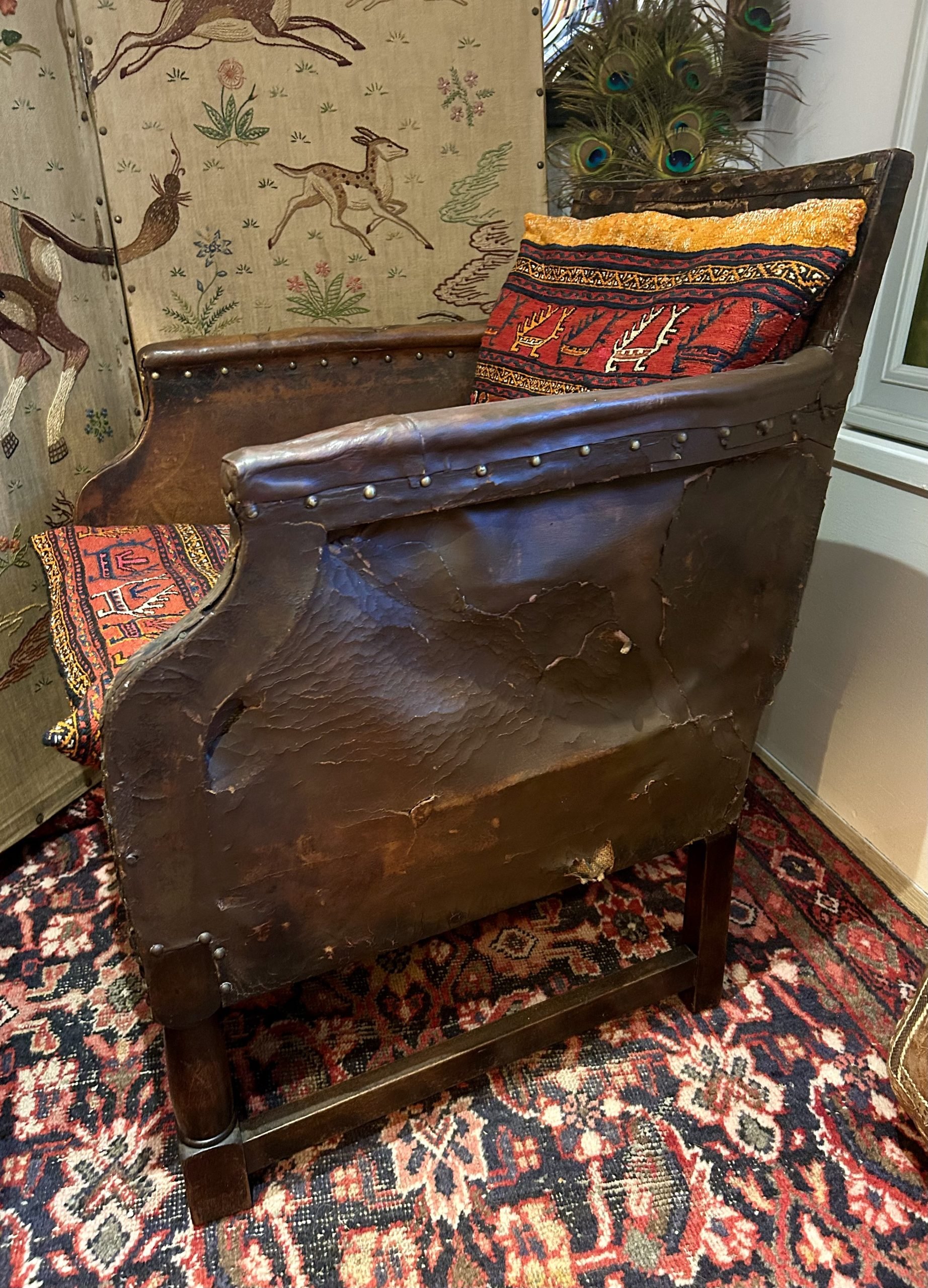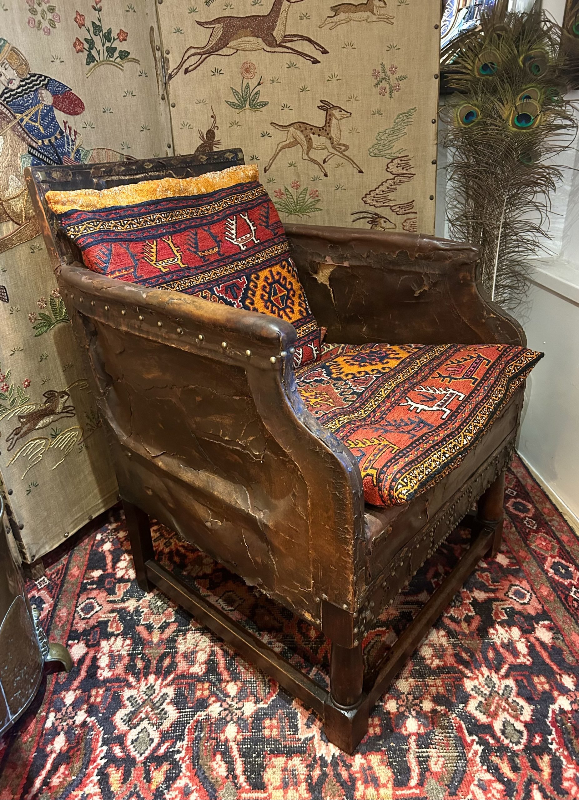 Attractively battered, worn and slightly torn, but after minimal careful and sympathetic intervention by us to stabilise the chair, and the addition of vibrant loose upholstery, this is a solid, useful and unique statement piece.