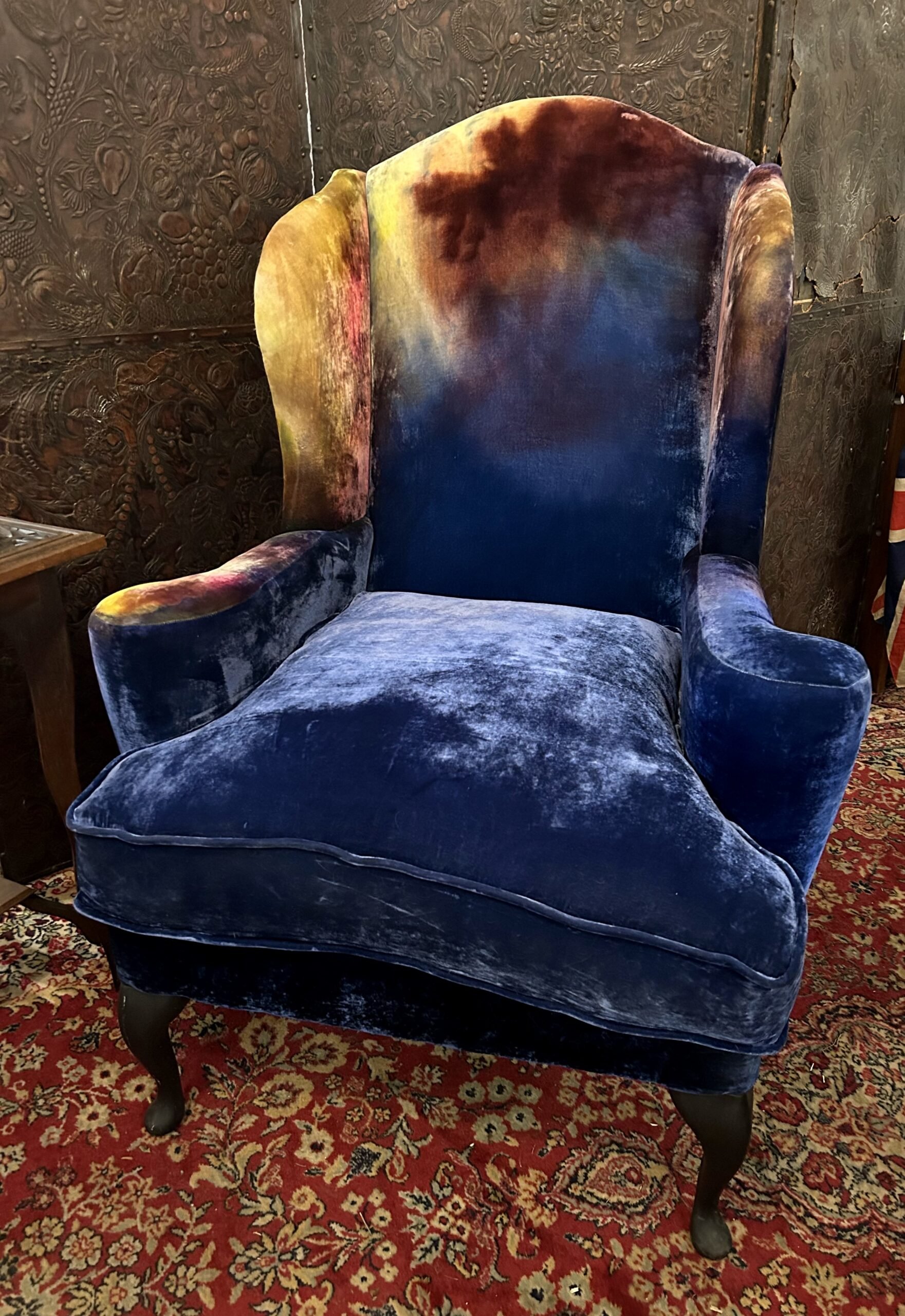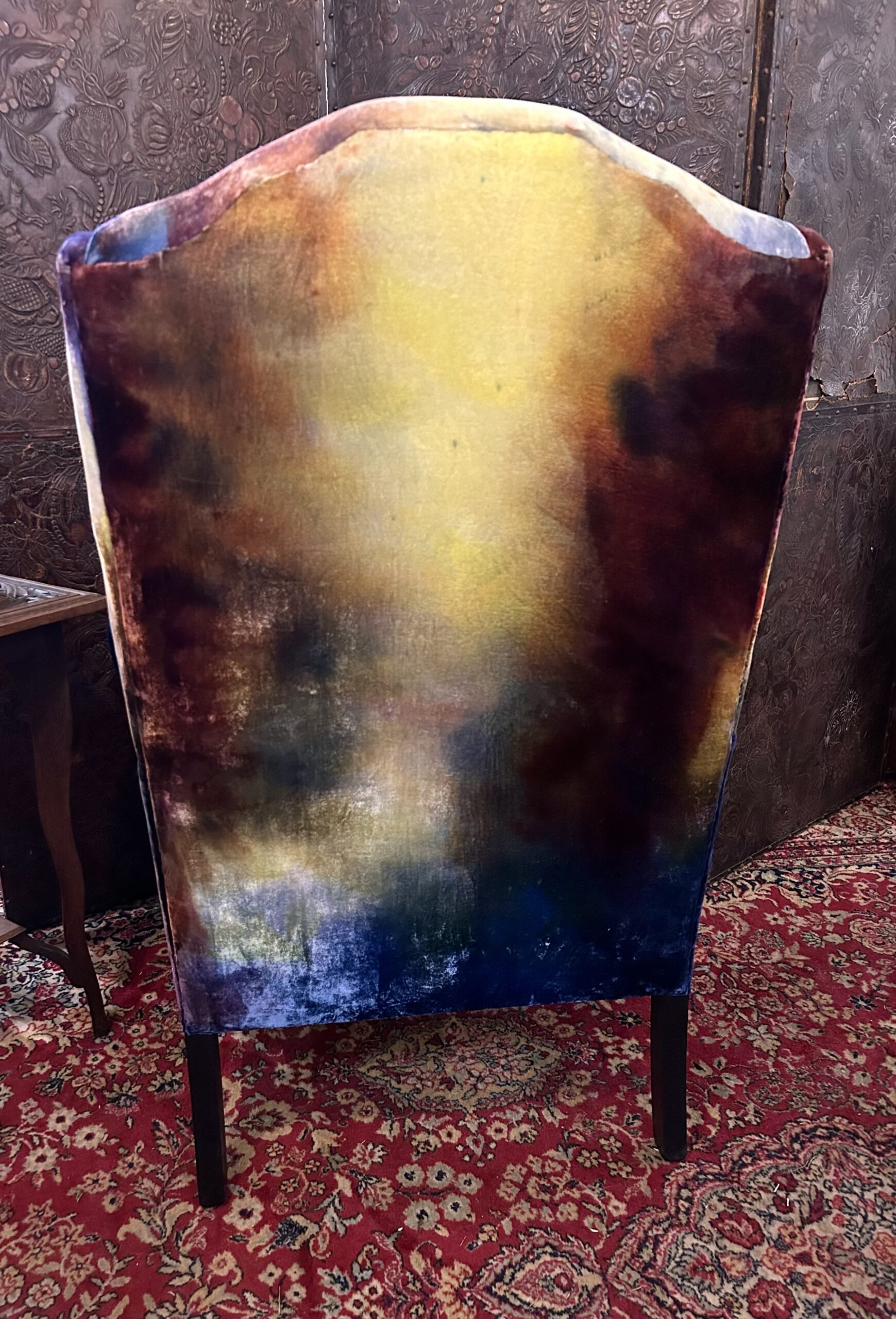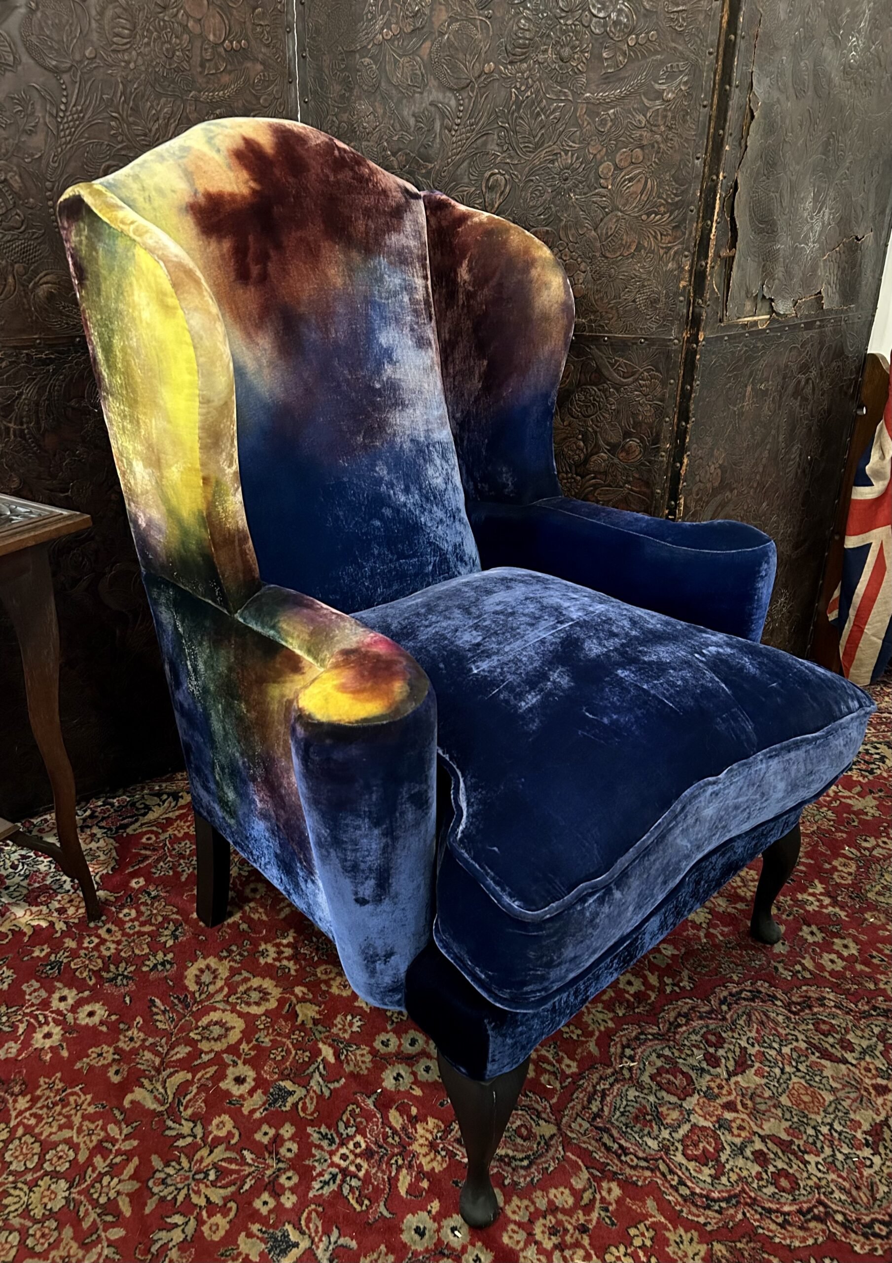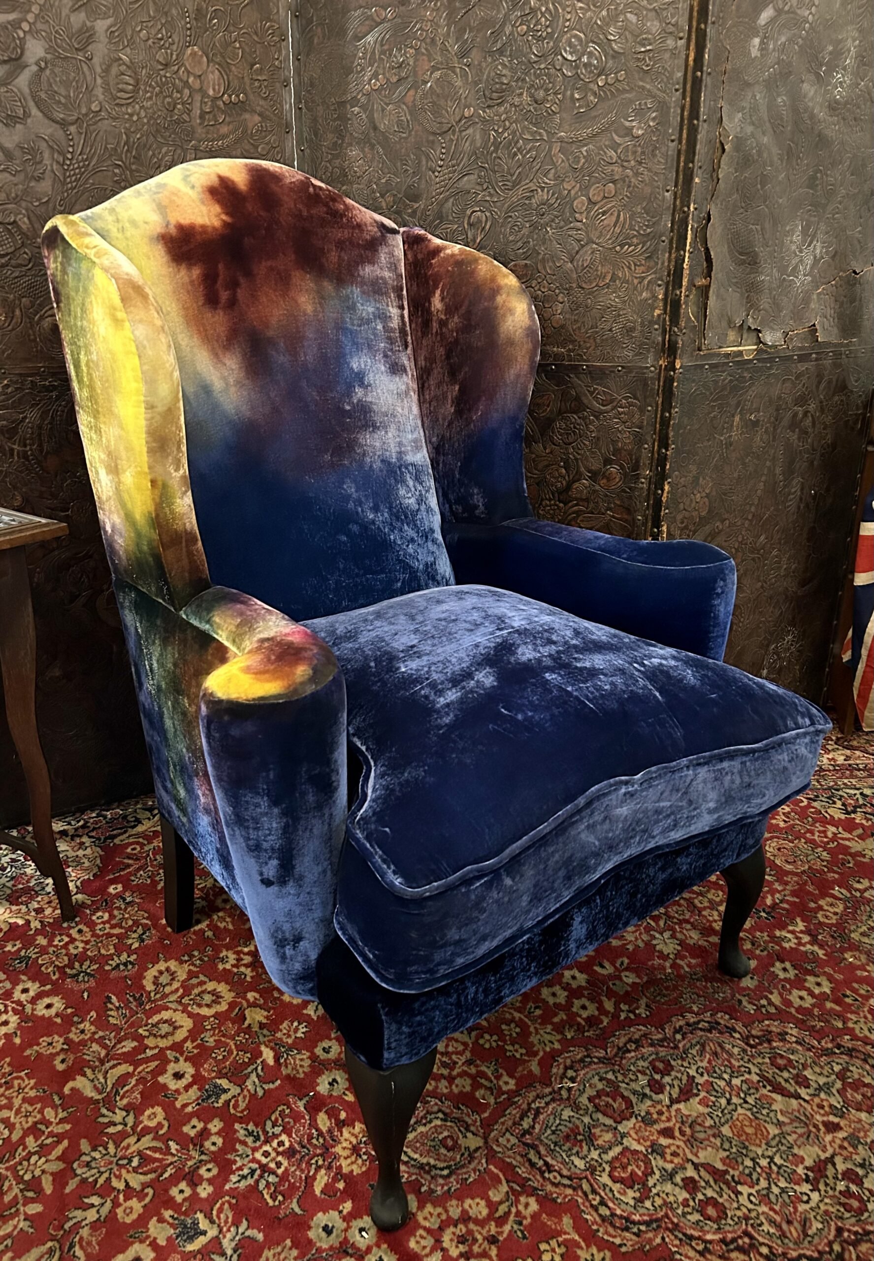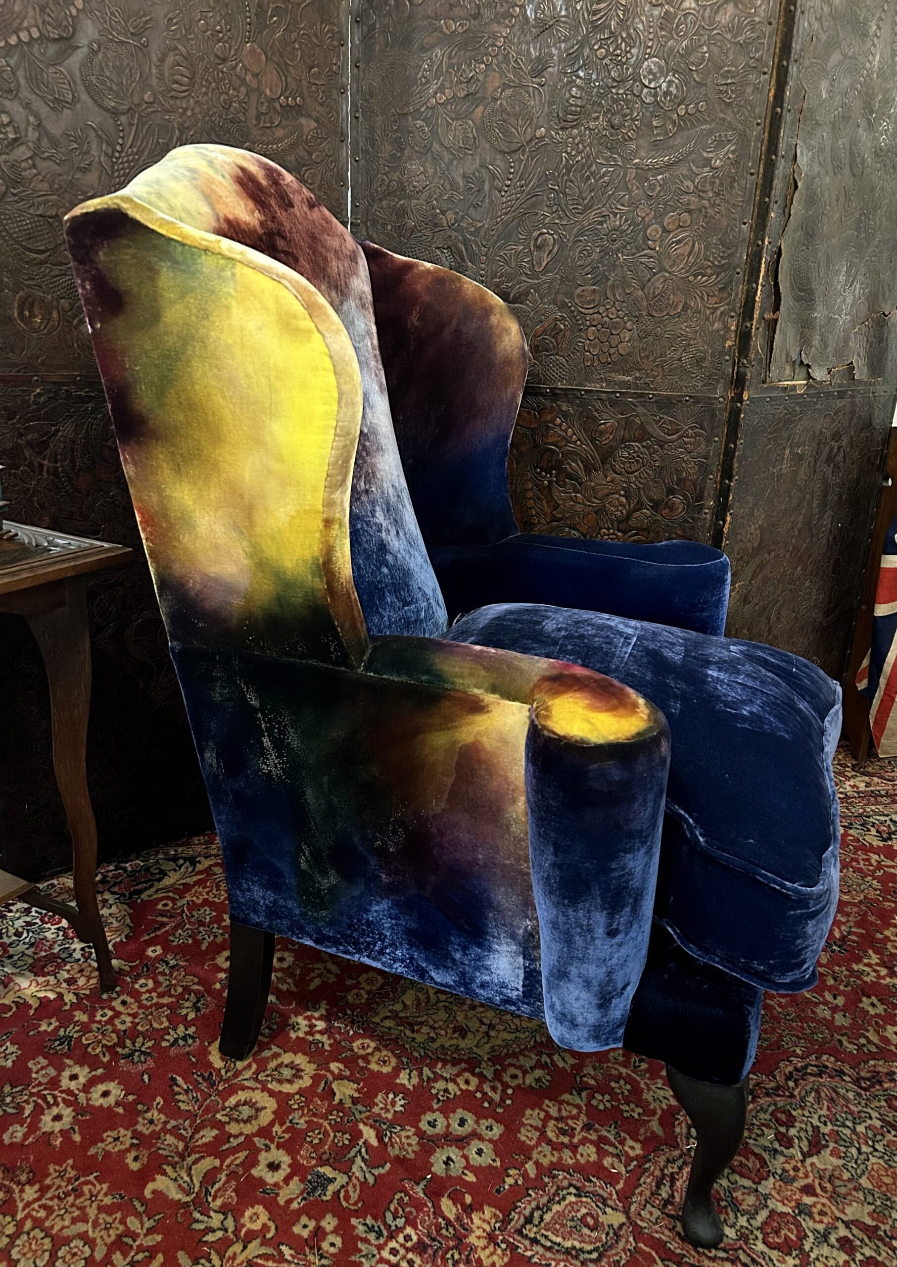A deep and extremely comfortable wingback armchair, craftsman made in English beech, beautifully upholstered in iridescent hand dyed silk velvet with ebonised legs. A unique and unusual piece of modern day Art Furniture from the enigmatic Tao of Cinderella, bringing their avant garde take on the Decorative Arts Movement.